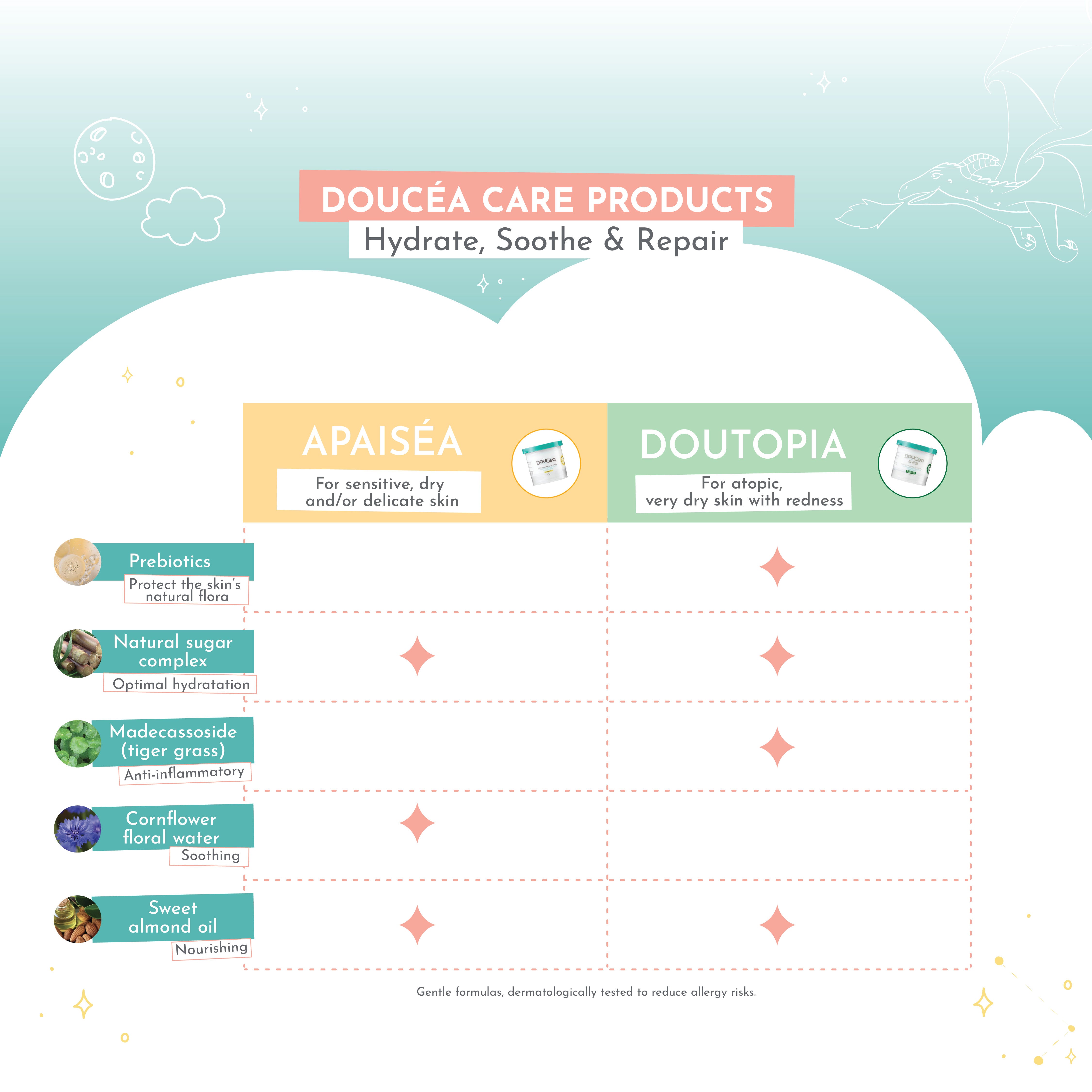 Doucéa products are specially formulated for delicate and sensitive skin, making them suitable from birth. However, we recommend caution when using scented products, even though APAISÉA has a suitable, hypoallergenic fragrance. Our advice would therefore be to wait until approximately 3 years of age before introducing scented products. However, DOUTOPIA treatment water and cream can be used from birth.