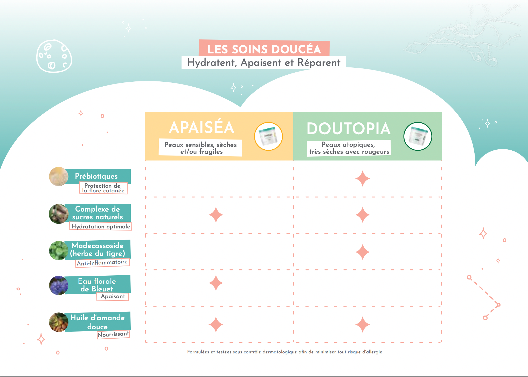 Les produits Doucéa sont spécialement formulés pour les peaux délicates et sensibles, ce qui les rend adaptés dès la naissance. Cependant, nous recommandons la prudence lors de l'utilisation de produits parfumés, même si APAISÉA est doté d'un parfum adapté et hypoallergénique. Notre conseil serait donc d'attendre jusqu'à environ 3 ans avant d'introduire des produits parfumés. En revanche, l'eau traitante et la crème DOUTOPIA peuvent être utilisées dès la naissance.